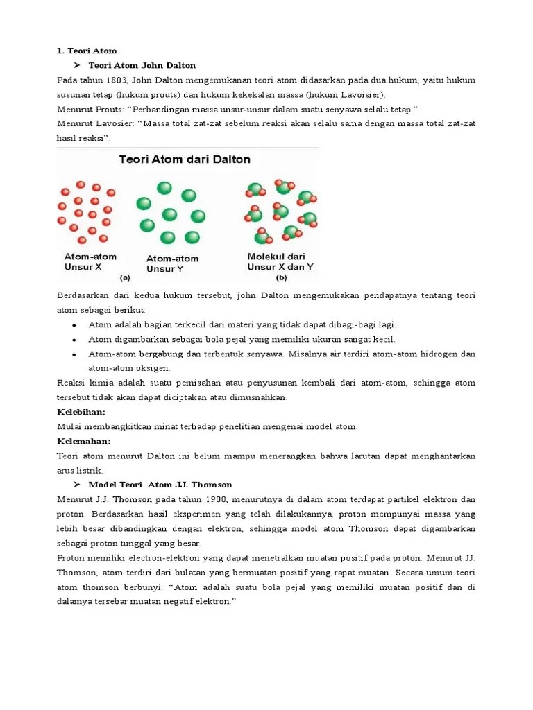 Atom merupakan bagian terkecil dari materi yang sudah tidak dapat dibagi lagi. Berdasarkan pemikiran bahwa konsep atom democristus sesuai dengan hokum kekekalan massa dan hokum perbandingan tetap, maka john dalton tahun 1803 merumuskan teori atom sebagai berikut. Misalnya, klorin memiliki dua isotop yang memiliki nomor massa 35 dan 37 satuan massa atom (sma). Pernyataan ini salah karena atom dari beberapa unsur berbeda dalam hal massa dan kepadatan. Pada tahun 1803, john dalton mengemukanan teori atom didasarkan pada dua hukum, yaitu hukum susunan tetap (hukum prouts) dan hukum kekekalan massa (hukum lavoisier). Berdasarkan pada pemikiran tersebut ia merumuskan teori atom, teori tersebut sebagai berikut : Gambar model atom rutherford tersusun atas inti atom dan elektron yang mengelilinya. Gambar model atom thomson diumpamakan seperti roti kismis. Misalnya, klorin memiliki dua isotop yang memiliki nomor massa 35 dan 37 satuan massa atom (sma).